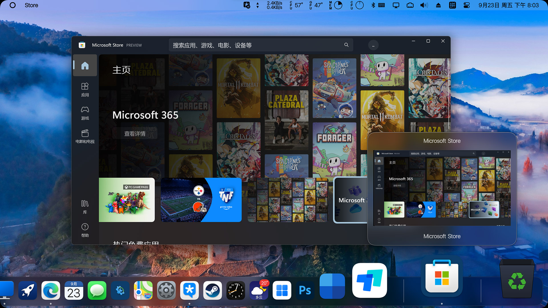 所有运行图标并且有窗口的程序可以鼠标悬停后显示窗口预览(支持UWP程序)需要在dock偏好设置-预览中开启,可自定义预览大小及延迟时间。