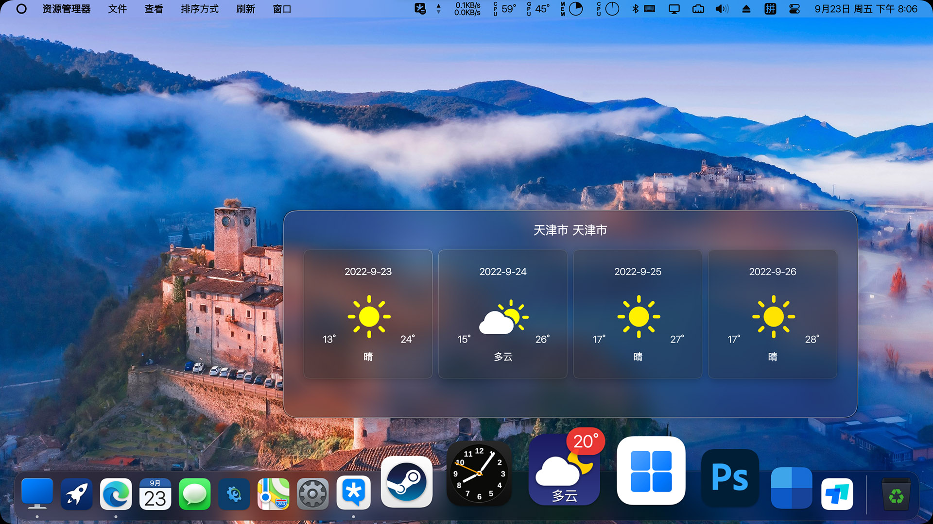 添加系统图标-天气预报 可添加天气图标,dock图标为实时天气 预览窗口为未来天气,所以图标会和预览显示天气有所出入。